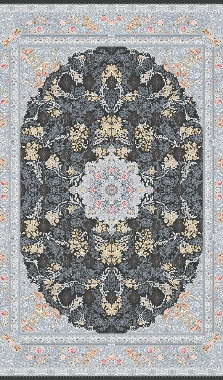 فرش ماشینی کاشان 700 شانه برجسته دیزاین 1200 نقشه ترنم زمینه زغالی
