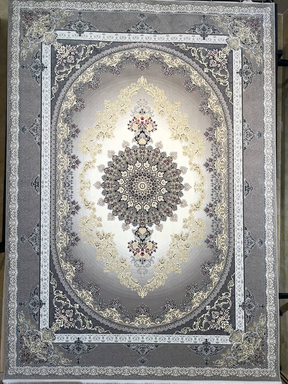 فرش ماشینی کاشان 700 شانه برجسته دیزاین 1200 نقشه سارین زمینه سیلور