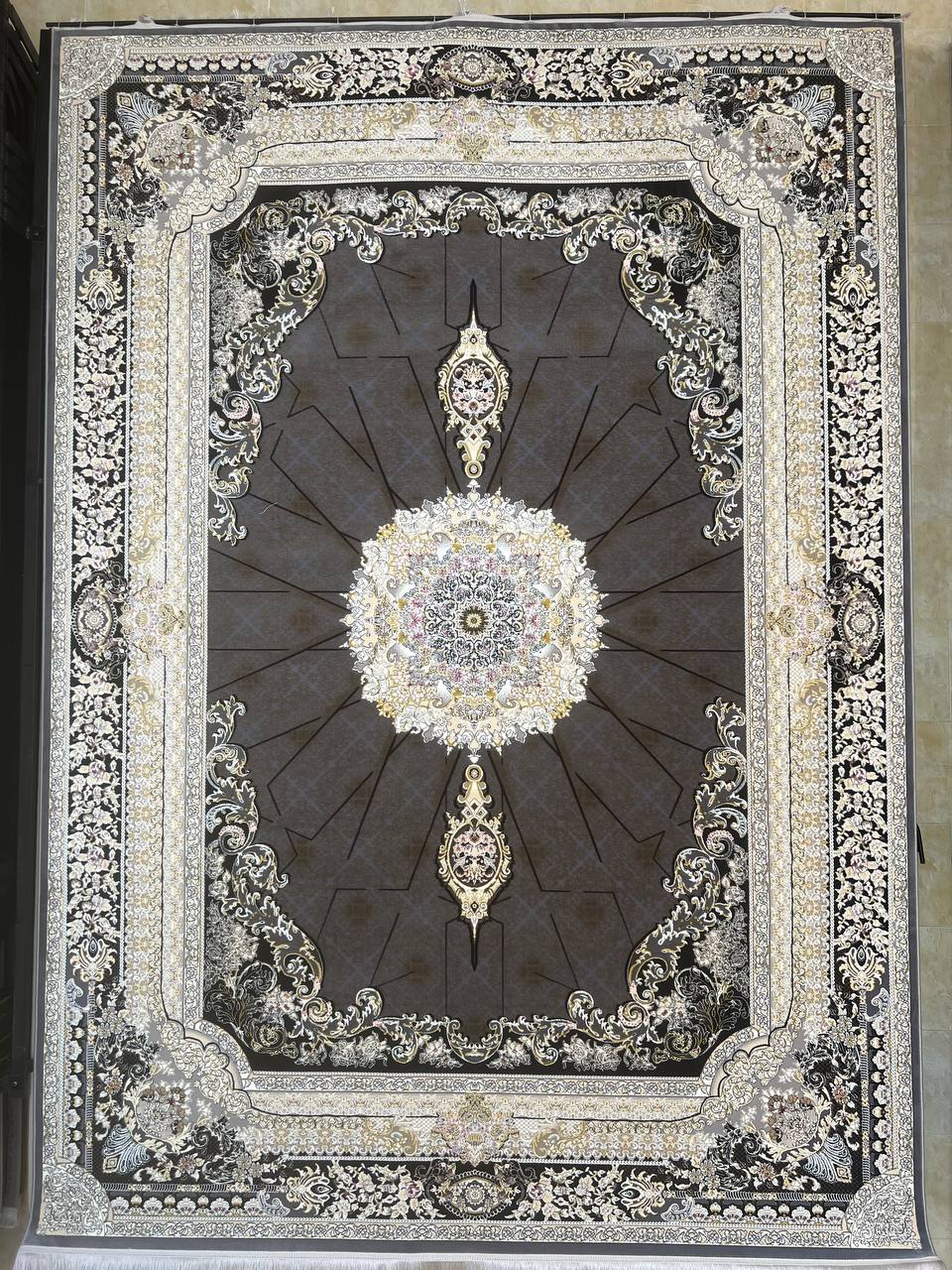 فرش ماشینی کاشان 700 شانه برجسته دیزاین 1200 نقشه مهتاب زمینه دودی